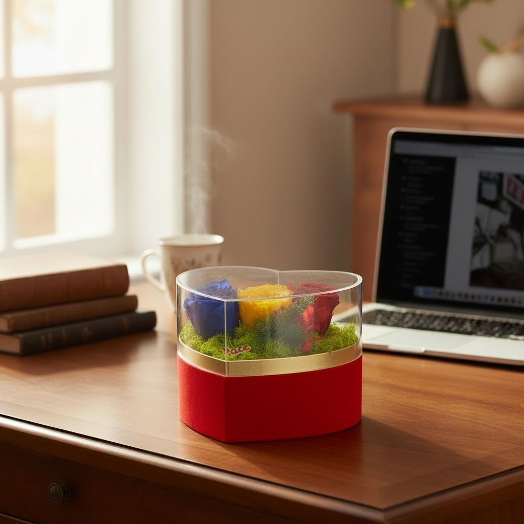 Acest aranjament in forma de inima contine trei trandafiri naturali criogenati, completat de hortensie stabilizata si elemente decorative fine, protejate de un capac transparent detasabil.