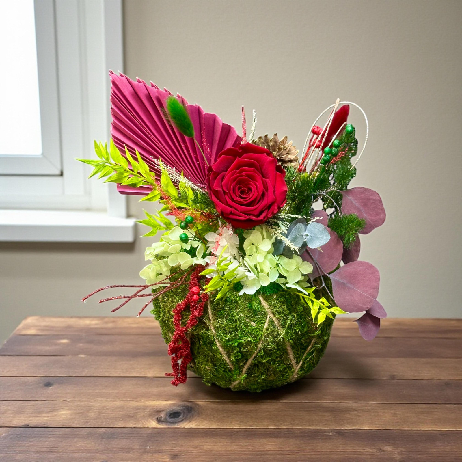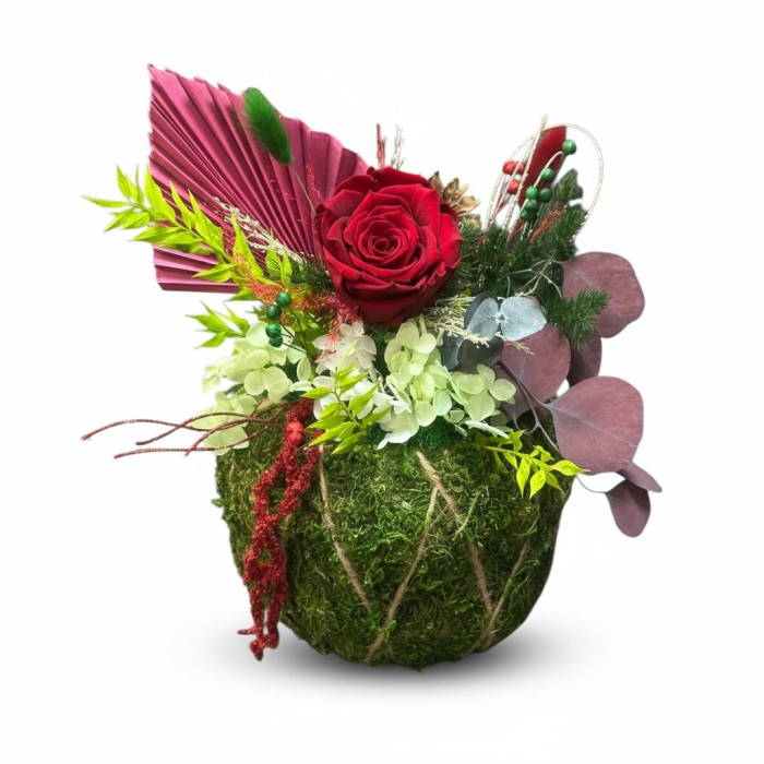 Forma rotundă, acoperită integral cu muschi, oferă volum, prospețime vizuală și un impact decorativ puternic, fiind completată de detalii atent alese: con de brad, bobițe decorative, frunze stabilizate și sfoară naturală care încadrează central floarea.