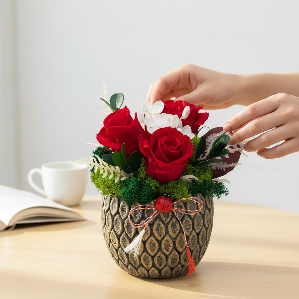 Acest aranjament floral cu trandafiri criogenati si licheni naturali stabilizati este o alegere eleganta pentru decor interior sau pentru un cadou special. Designul sau natural imbina perfect textura bogata a lichenilor stabilizati cu frumusetea clasica a trandafirilor criogenati, rezultand un decor premium care isi pastreaza aspectul impecabil pentru multi ani.
