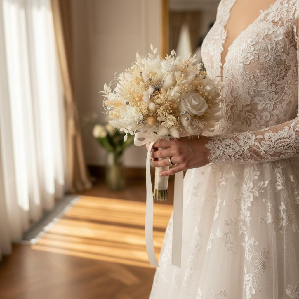 Buchetul de mireasa este realizat in aceeasi tematica, folosind 3 trandafiri criogenati, hortensie criogenata si plante naturale uscate, oferind un aspect romantic si sofisticat. Florile criogenate isi pastreaza frumusetea pentru ani de zile, fara a necesita apa sau ingrijire.