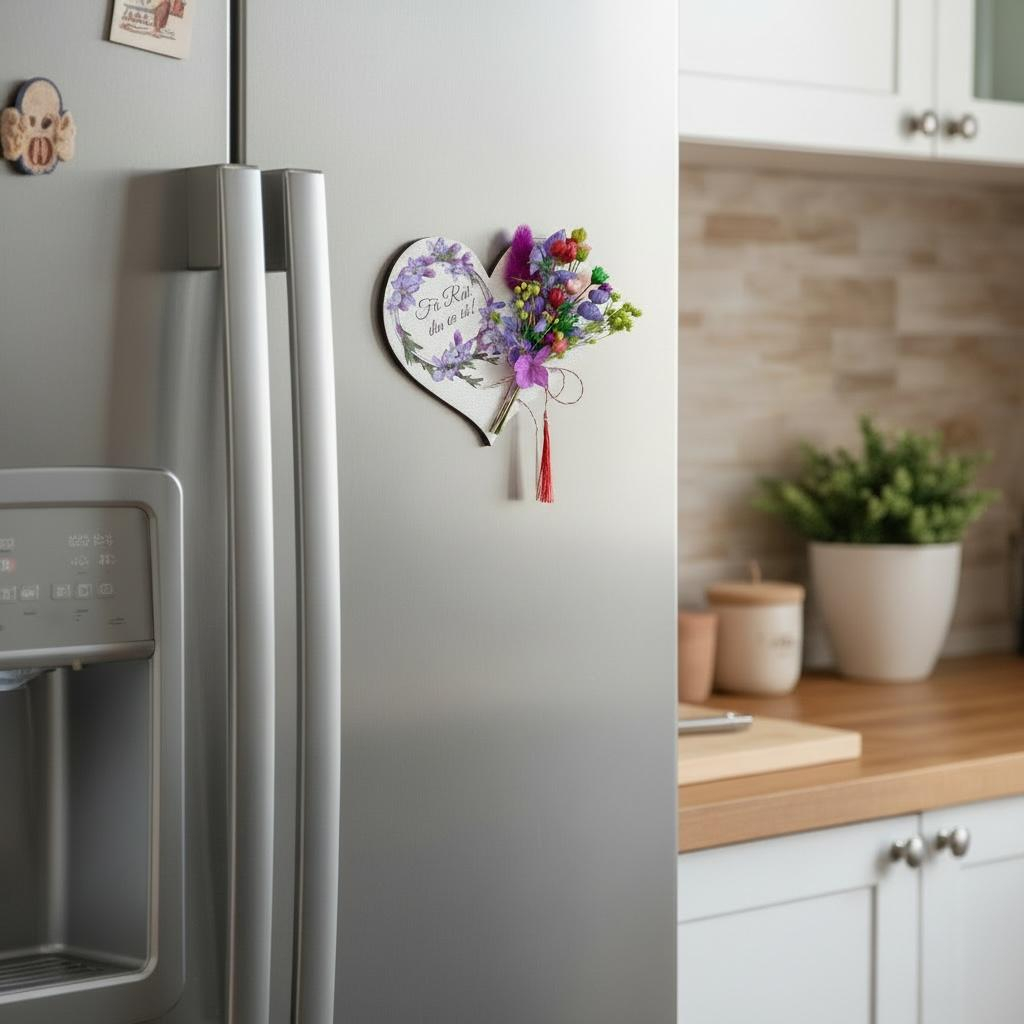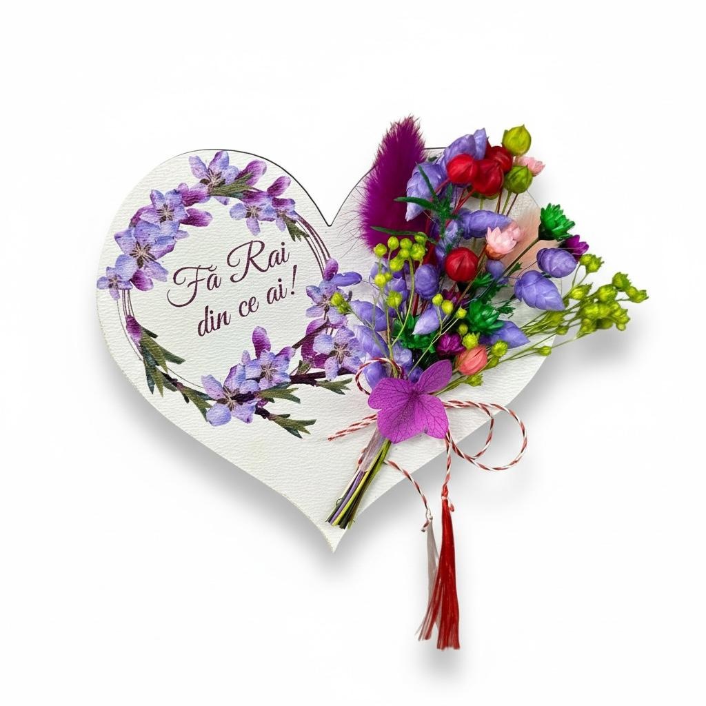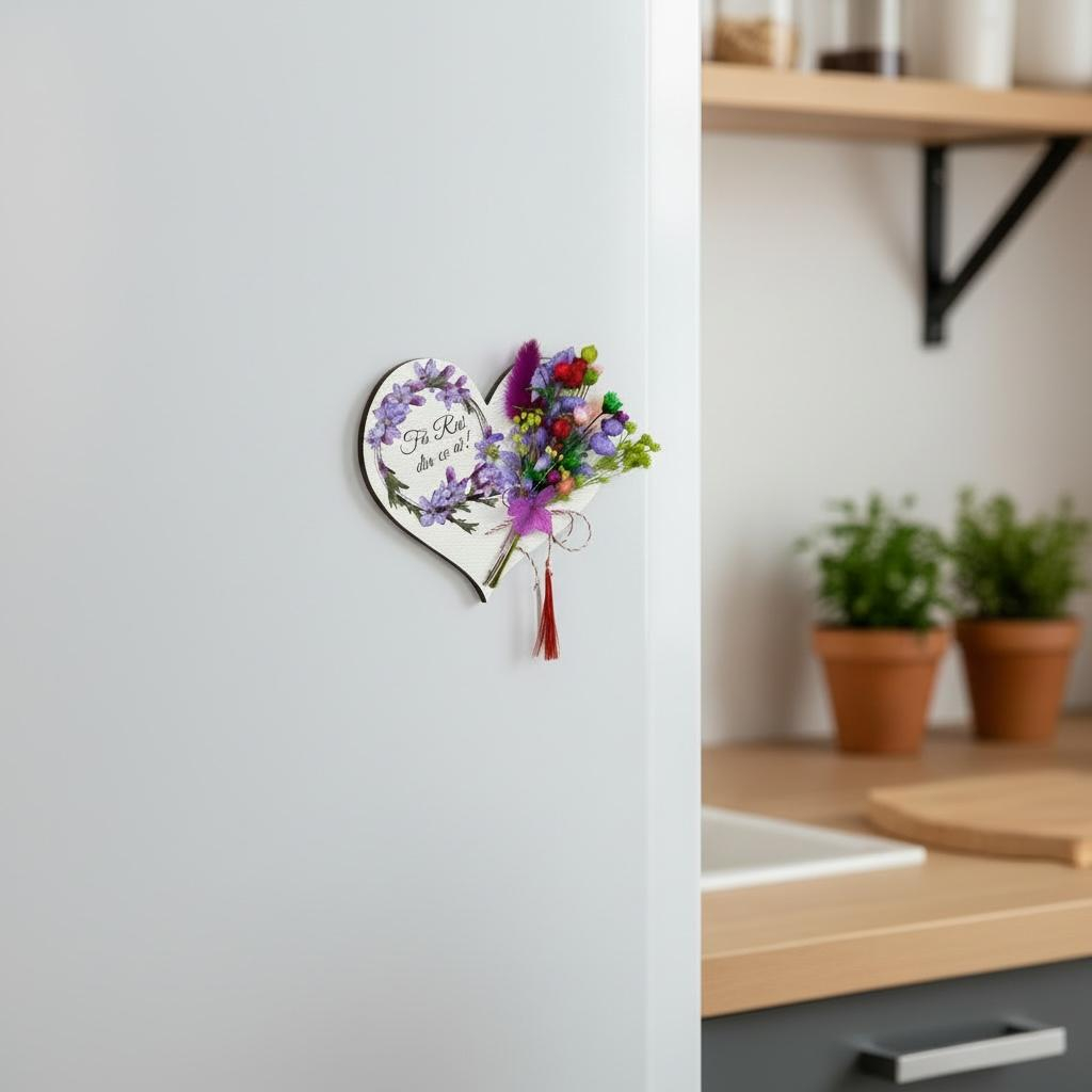 Acest mărțișor tip magnet de frigider, realizat manual de Eventissimi, este conceput sub forma unei inimi din mdf printata uv  si decorata cu flori naturale uscate, păstrate în timp fără întreținere.