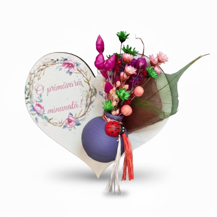 Eventissimi® Martisor " O primavara frumoasa" inima personalizabila, cu mini vaza mov, flori naturale uscate, multicolor, prindere tip magnet